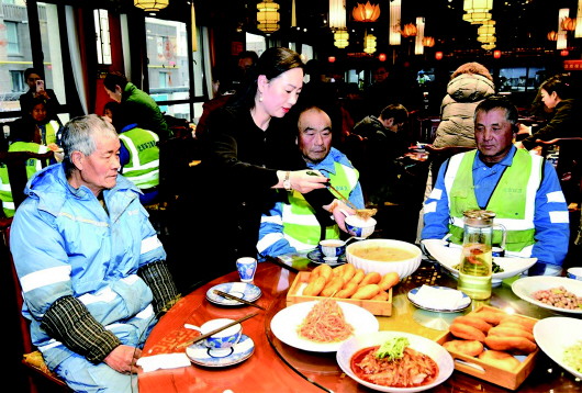 “今天我们为环卫工人送去爱心腊八粥,就是希望让更多在凛冽寒风中坚守岗位的环卫工人,感受到来自社会大家庭的温暖。一碗香甜可口、香味四溢的腊八粥,让这些城市美容师感受到这座城市给予他们的敬意与关怀。”爱心餐饮企业总经理赵仰文如是说。