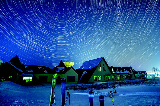 1月29日在黑龙江亚布力滑雪旅游度假区拍摄的星空下的游客服务中心(堆栈合成照片)。