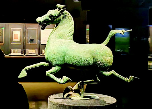20世纪60年代,甘肃省武威市雷台汉墓出土了这匹蹄掠飞隼、腾空疾驰的青铜马。与铜奔马一起出土的还有一支由28匹马、1头牛、13辆马车、1辆牛车、17个持矛戟武士、28个奴婢组成的铜车马仪仗俑队列,气势恢弘。