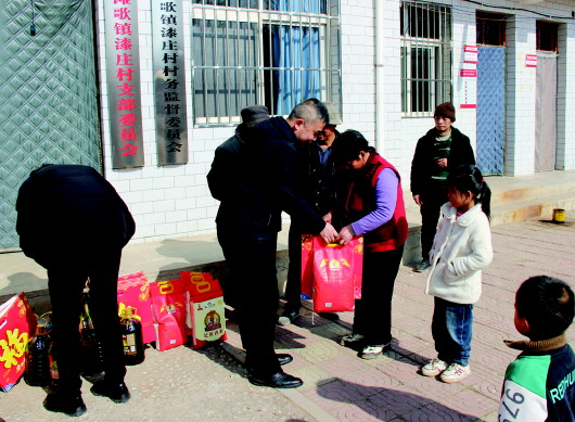 在滩歌镇漆庄村,帮扶干部与“结对关爱”对象亲切交流,详细询问他们的生产生活和健康状况,仔细查看过冬取暖物资、衣物等准备情况,叮嘱他们注意用火、用电、用煤安全,提高自我防范意识,确保平安过节、舒心过年。随后,帮扶干部为关爱对象送上大米、食用油、春联等生活物资,用贴心的问候、实在的帮助,让群众在寒冬里感受到浓浓的暖意。