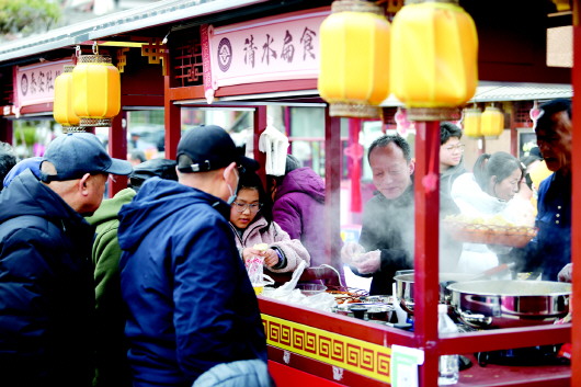 “秦安蒜面,免费品尝!”刚尝过酸辣肚丝汤,记者又被吆喝声吸引到祥云楼蒜面摊位前。摊主熟练地将亮黄的宽面盛入碗中,舀上蒜面汤,淋上油泼辣子,一碗地道的秦安风味便送至游客手中。一口下肚,游客连连点头,便是对这份风味最好的肯定。