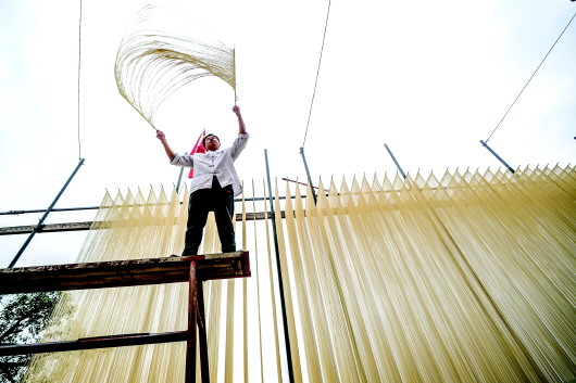 2月22日,在四川省德阳市中江县觉慧村,村民在晾晒手工面条。