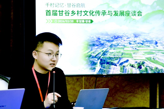 让人意外的是,这些短视频的制作者,也是当天这场“千村记忆·甘谷启航——首届甘谷乡村文化传承与发展座谈会”的发起人,竟是一位90后年轻人,名叫张康乐。他坐在会议室前排,戴着一副黑边眼镜,斯文白净,笑起来还有几分腼腆。趁着中场休息,记者上前搭话:“小张老师,你的这些视频拍得真好,大家都爱看。”