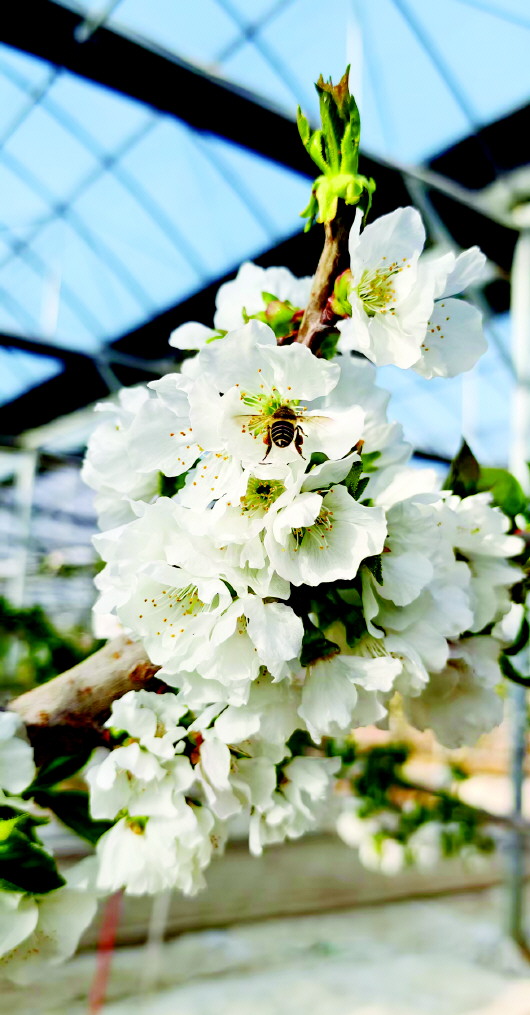 ▲大棚里面正在绽开的樱桃花