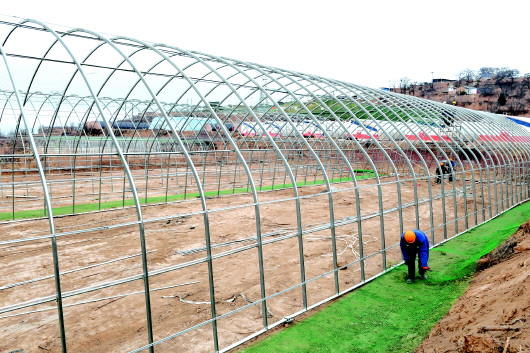 近日,秦安蜜桃智慧农场的工人正在建设日光温室大棚。