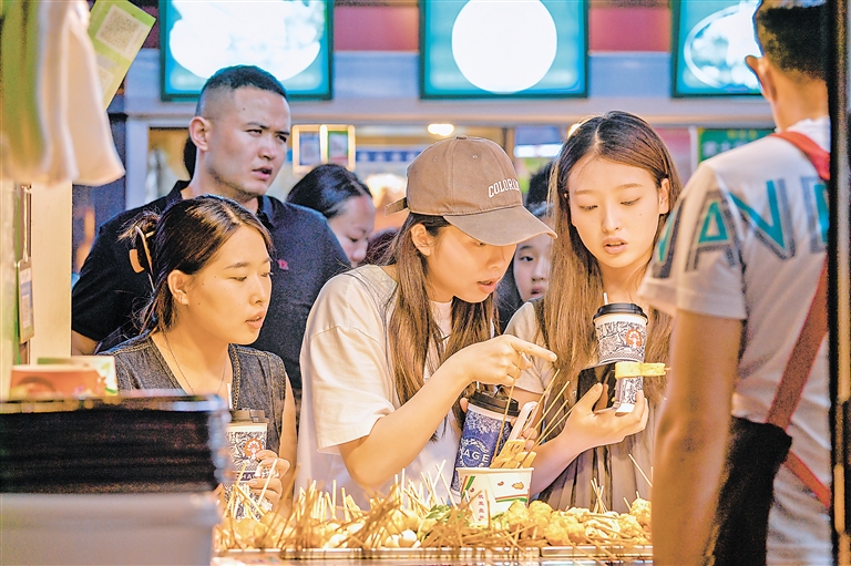 兴庆区素来以美食闻名,入夏以来,逛夜市、吃当地特色小吃成为游客首选。敬德夜市运营公司总经理刘涛介绍,目前敬德夜市入驻商家586户,营业收入超4亿元,间接带动新增商户30余家,提供超3000个就业岗位,单日人流量超1.5万人次。