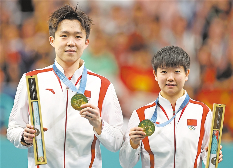 7月30日,冠军中国组合王楚钦(左)/孙颖莎在颁奖仪式上。当日,在巴黎奥运会乒乓球混双决赛中,中国组合王楚钦/孙颖莎4比2战胜朝鲜组合李正植/金琴英,获得冠军。 新华社发