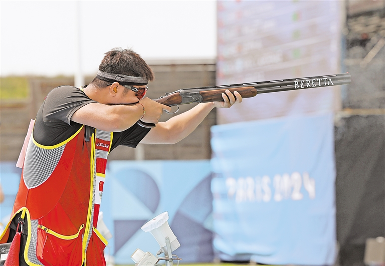 7月30日,齐迎在比赛中。当日,在法国沙托鲁射击中心举行的巴黎奥运会男子多向飞碟决赛中,中国选手齐迎获得亚军。 新华社发