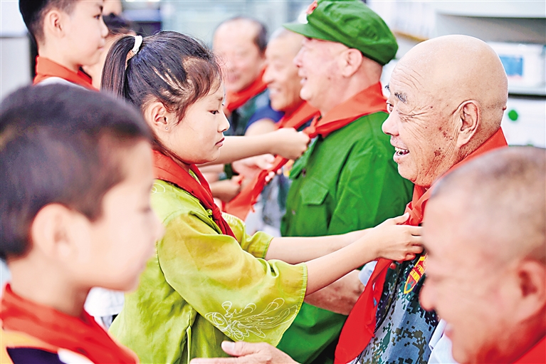 7月31日,少先队员为退役老兵系上红领巾,向他们致以崇高的敬意。当日,银川市兴庆区银古路街道丽水社区邀请社区退役军人和青少年代表共同开展迎“八一”建军节主题活动,营造辖区崇军爱军氛围。本报记者 马楠 王洋 实习生 杨佳梁 摄
