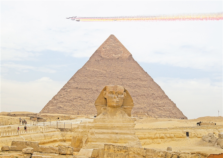当地时间28日中午,中国空军1架运-20与空军八一飞行表演队6架歼-10表演机编队飞越金字塔上空,歼-10表演机在空中拉出象征中埃两国国旗颜色的6道彩烟,吉萨金字塔景区内的观众争相合影留念。