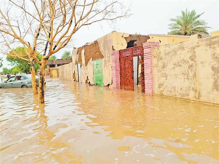 8月27日,在苏丹北方州栋古拉,房屋被积水包围。 苏丹卫生部27日说,该国已有10个州遭遇暴雨和洪涝灾害,造成至少138人死亡。 新华社发