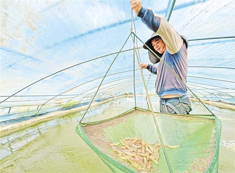 8月30日,养殖户展示捕捞的南美对虾。近期,贺兰县立岗镇兰光村水产养殖基地的南美白对虾陆续上市。近年来,贺兰县做好常规鱼提质增效、名特优扩量增收、生态鱼恢复增养等“三条渔”文章,立足水资源、渔业资源优势,充分挖掘渔业产业新模式,不断巩固适水产业发展优势。其中,2024年南美白对虾池塘养殖面积为290亩,设施温棚养殖面积为173019.24平方米,工厂化车间养殖面积为8890平方米,预计今年养殖总产量为87.25吨。 本报记者 马楠 王洋 摄