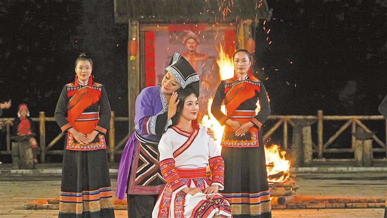 8月25日,金秀瑶族自治县长垌乡平道村古占屯的民俗表演。8月24日到25日,由中央宣传部会同中央统战部、国家民委联合开展的“铸牢共同体 中华一家亲”主题宣传之“八桂大地展新颜”集中采访活动走进广西壮族自治区来宾市金秀瑶族自治县,聚焦金秀民族团结亮点成效。近年来,金秀因地制宜发展文旅、康养、瑶医药等特色产业,吸引海量游客光顾,实现巩固拓展脱贫攻坚成果同乡村振兴有效衔接。本报记者 杜晓星 李宏亮 摄