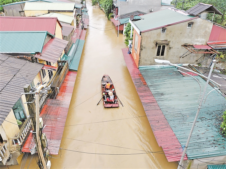 9月10日,在越南安沛省,救援队划船转移受困群众。