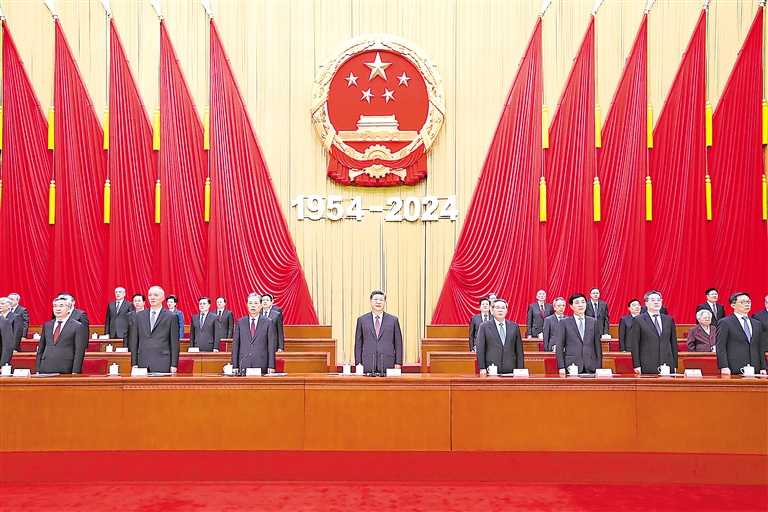 大会在雄壮的国歌声中开始。习近平发表了重要讲话。他指出,人民代表大会制度是中国共产党领导中国人民艰辛探索长期奋斗的成果,是从中国土壤中生长起来的全新政治制度,是人类政治制度史上的伟大创造。人民代表大会制度的建立,意味着中国政治从根本上实现了由少数人掌握政权、绝大多数人受压迫被剥削到中国共产党领导、人民当家作主的伟大跨越,实现了中国政治制度的伟大变革。