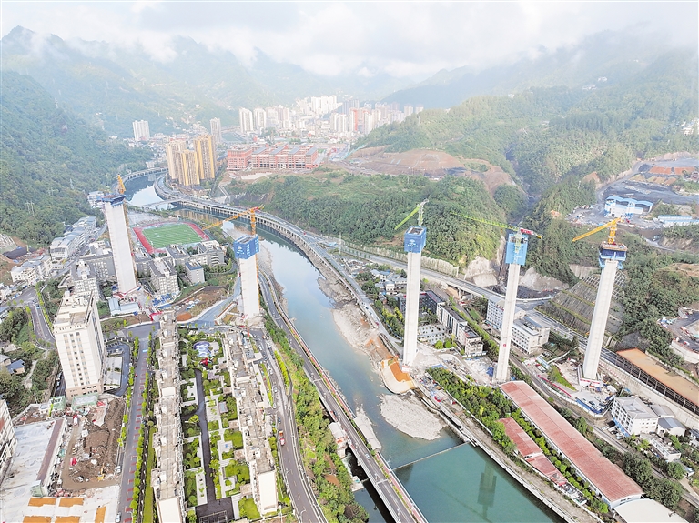 9月14日拍摄的西渝高铁任河特大桥建设现场(无人机照片)。记者从京昆高速铁路西昆有限公司获悉,9月14日,由中铁十二局承建的西渝高铁任河特大桥12号主墩0号块顺利开始浇筑,标志着西渝高铁全线重难点工程任河特大桥桥梁作业环节由下部结构转换成上部结构,全桥建设进入桥面施工阶段。西渝高铁是我国“八纵八横”高铁网北京至昆明的京昆通道和包头、银川至海口的包(银)海通道的重要组成部分。 新华社发