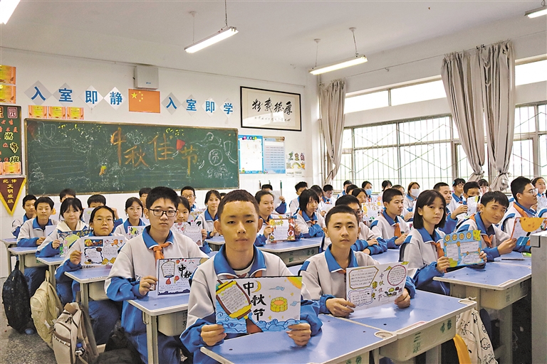 “提起中秋节,你会想到什么?”“月亮”“月饼”“嫦娥奔月”……9月11日下午,走进银川市唐徕中学宝湖校区,八年级二班正在进行一场“千里明月 情满中秋”的主题班会课,学生主讲人杜文婧每抛出一个问题,同学们都热情回应。