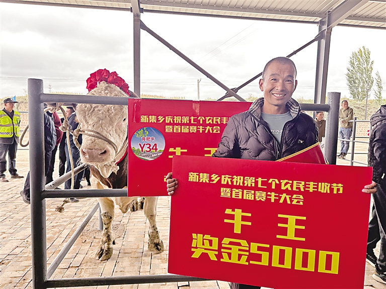 9月20日,村民马福宝养的牛获得育肥牛一等奖,被评为“牛王”。当天下午,彭阳县新集乡庆祝第七个“中国农民丰收节”暨首届“赛牛会”在该乡新建的活畜交易中心举行。目前,新集乡肉牛饲养量达8.2万头,年出栏4.2万头,纯收入1.26亿元。 本报记者 常宽 摄
