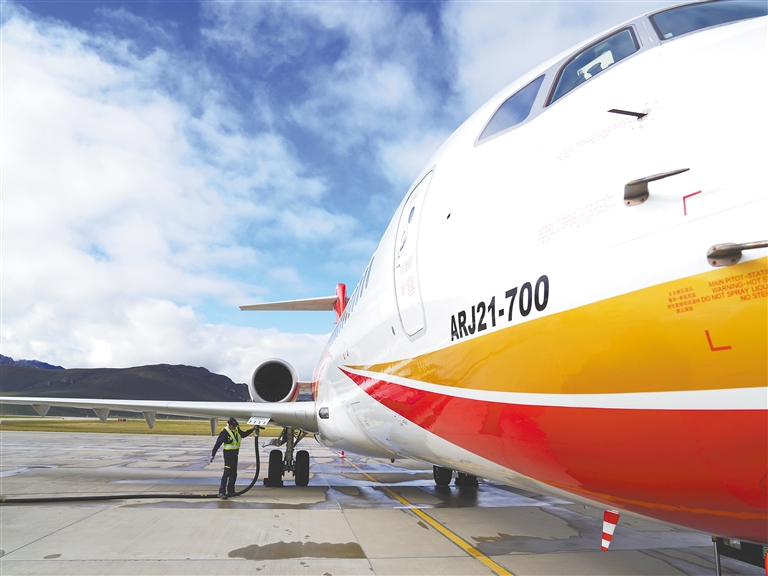9月21日,在青海果洛玛沁机场,工作人员在为国产商用飞机ARJ21加油。当日,中国商飞一架ARJ21飞机从西藏拉萨贡嘎国际机场起飞,途径青海果洛玛沁机场,最终降落在青海西宁曹家堡国际机场。自今年8月21日开始,ARJ21飞机以四川成都、青海西宁和西藏拉萨为运行基地,开展“环青藏高原”演示飞行。累计完成25条航线、55个航段、62小时的飞行任务,覆盖11座高高原机场,并4次执飞世界海拔最高民用机场——稻城亚丁机场,充分验证了ARJ21飞机高高原运行的适应性。 新华社发