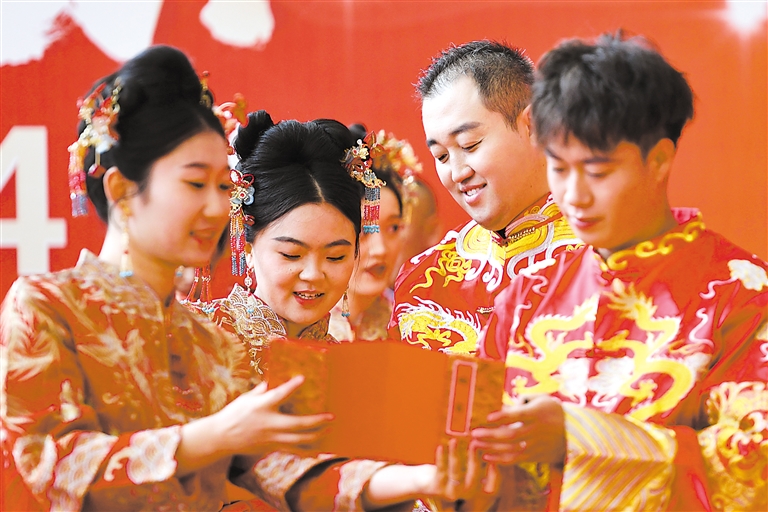 9月22日,参加集体婚礼的新人签订婚书。当日,由全国妇联等单位主办的“家国同庆 见证幸福”2024年全国万人集体婚礼在全国50个会场同步举行。在宁夏分会场(宁夏国际会堂),来自我区党政机关、企事业单位、部队、城乡社区的31对适龄、“零彩礼”、“低彩礼”的新人共赴古朴典雅的中式婚礼,共倡新风,共迎新中国75周年华诞。本报记者 杨淑琼 白茹 贺紫瑞 摄