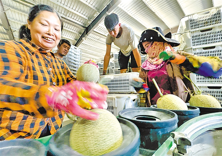 银川市兴庆区月牙湖乡蜜瓜种植基地,工人们将成熟的蜜瓜包装后销往外省区。 本报记者 马楠 摄