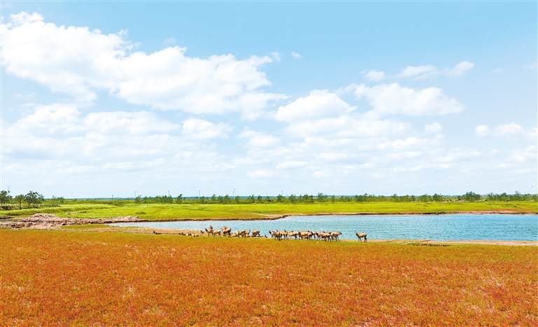 9月23日,麋鹿在江苏东台条子泥湿地觅食(无人机照片)。时下,秋色斑斓,构成一幅美不胜收的秋日画卷。新华社发