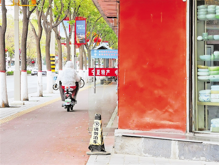 9月17日,记者路过银川市兴庆区新华西路,看见一市民骑着电动车突然急刹车,后面跟随的一辆电动车险些追尾,而“罪魁祸首”就是这扇玻璃门,位于路口且透明的玻璃门向外敞开,骑行者往往无法及时发现,存在一定交通安全隐患。