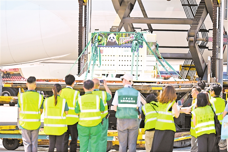 9月26日,在香港国际机场,大熊猫被运出机舱。 当日,第三对中央赠港大熊猫“安安”“可可”搭乘专机抵达香港国际机场,随后换乘专车抵达位于香港海洋公园的新家。新华社发