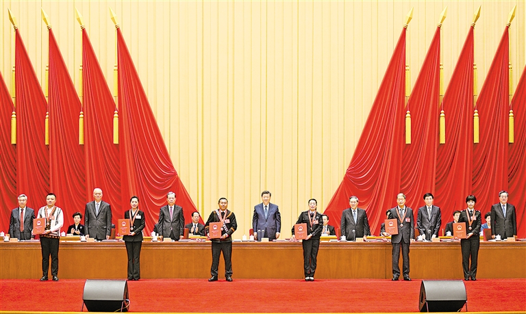 在欢快的乐曲声中,习近平等为受表彰的模范个人和模范集体代表颁奖。