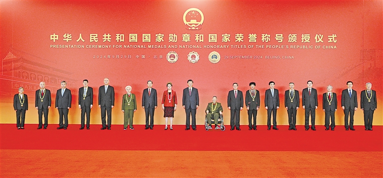 9月29日,中华人民共和国国家勋章和国家荣誉称号颁授仪式在北京人民大会堂金色大厅隆重举行。中共中央总书记、国家主席、中央军委主席习近平向国家勋章和国家荣誉称号获得者颁授勋章奖章并发表重要讲话。 新华社记者 鞠鹏 摄