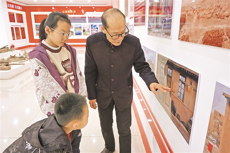 谢兴昌指着墙上的资料照片,给谢孜涵姐弟俩讲述在西海固老家的艰难岁月。 本报记者 陈郁 摄