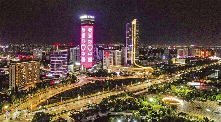 10月1日,夜幕降临后,位于银川市北京中路的德丰大厦打出“我爱你,中国”的巨幅标语。为庆祝中华人民共和国成立75周年,国庆假期期间,银川市多处地标建筑用绚烂的光影深情告白祖国母亲。 本报记者 王晓龙 摄