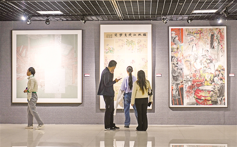10月2日,记者在银川美术馆看到,不少市民来参观“山河壮美石榴红”展览。据悉,本次展览以“山河壮美石榴红”为主题面向全区征稿,共征集到书法、美术、摄影等作品合计3710件,组织区内专家评出235件精品入展。 本报记者 马赛尔 李宏亮 摄