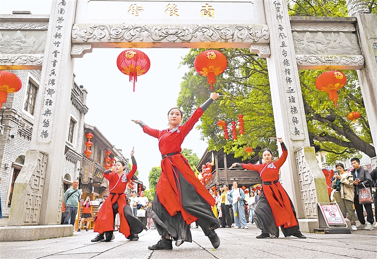 10月4日,青年演员身着中国传统服饰,在福州南后街展示“三条簪”妆束,吸引游客驻足观看。 新华社发