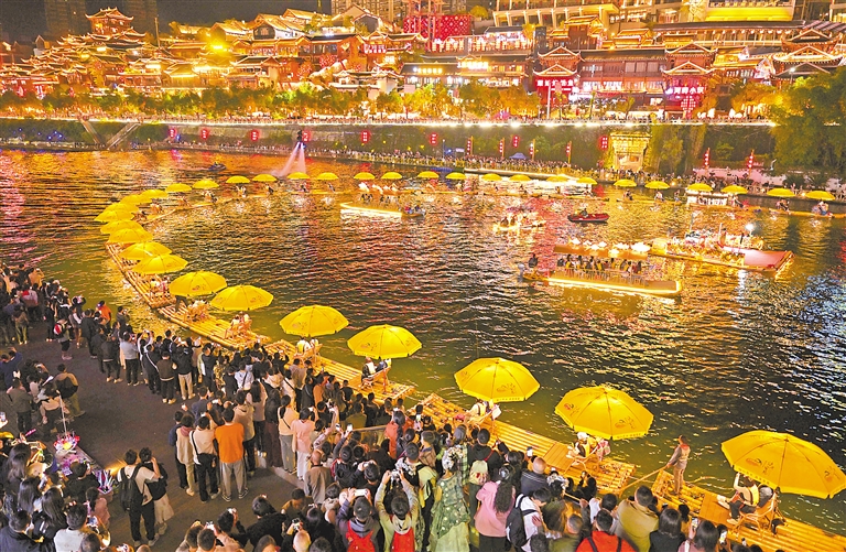 10月3日,游客在湖北省恩施土家族苗族自治州宣恩县城贡水河上乘坐竹筏赏夜景。 新华社发