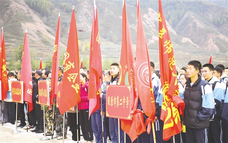 “天高云淡,望断南飞雁。不到长城非好汉,屈指行程二万。六盘山上高峰,红旗漫卷西风。今日长缨在手,何时缚住苍龙?”年轻的学生们以饱满的热情齐声朗诵《清平乐·六盘山》,嘹亮的嗓音在群山之间回荡,激励着每一位队员。