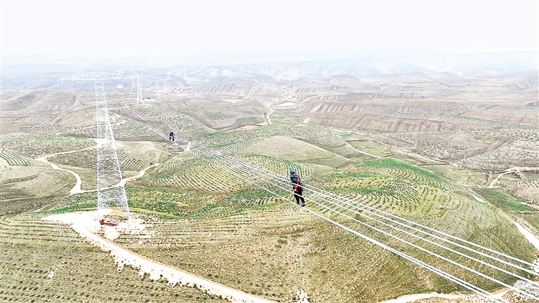 近日,宁夏至湖南的±800千伏特高压直流输电线路工程(宁夏段)完成区内首跨±800千伏天中线的施工任务,为全线顺利贯通奠定了基础。 本报记者 鲁延宏 摄