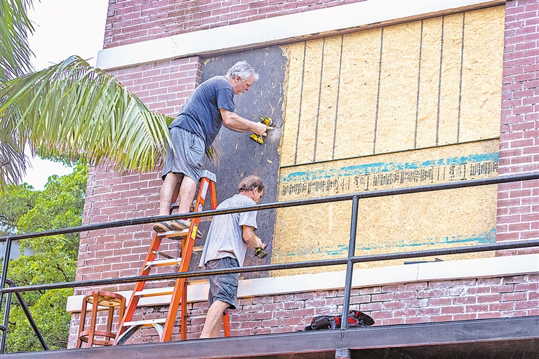 10月8日,在美国佛罗里达州迈尔斯堡,当地居民在房屋二楼窗户上固定胶合板,为迎接飓风“米尔顿”做准备。飓风“米尔顿”7日骤然升级为最高级别五级,继续向美国佛罗里达州逼近,预计将成为继9月26日四级飓风“海伦妮”登陆佛罗里达州后两周来侵袭该州的第二场超强风暴。新华社/欧新