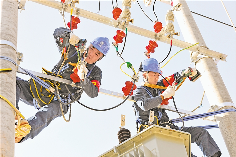 10月11日,2名选手协同进行高压避雷器引线安装。当日,2024年宁夏电力行业职业技能竞赛设置了配电线路工和继电保护工两个工种,240名一线职工参加竞赛。 本报记者 鲁延宏 摄