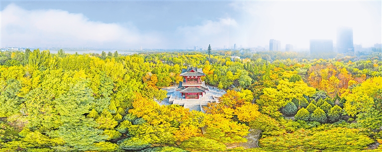 10月13日清晨,厚厚的浓雾弥漫在城市间,透过无人机镜头俯瞰银川海宝公园处处皆风景。 本报记者 马楠 摄