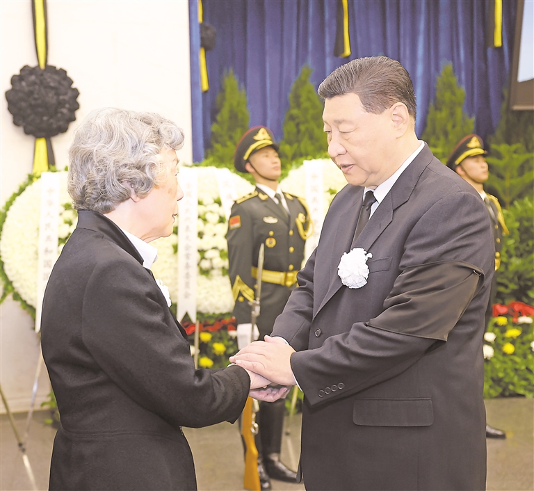 10月14日,吴邦国同志遗体在北京八宝山革命公墓火化。习近平、赵乐际、王沪宁、蔡奇、丁薛祥、李希、韩正等前往八宝山送别,胡锦涛送花圈表示哀悼。这是习近平与吴邦国亲属握手,表示深切慰问。 新华社记者 鞠鹏 摄