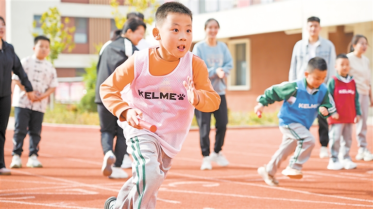 10月14日,孩子们在接力跑比赛中。当天,银川市金凤区第十七小学举办秋季趣味运动会,旨在通过丰富多彩的体育活动,丰富校园文化生活,增强学生的体质健康,同时培养他们的团队精神和集体荣誉感。