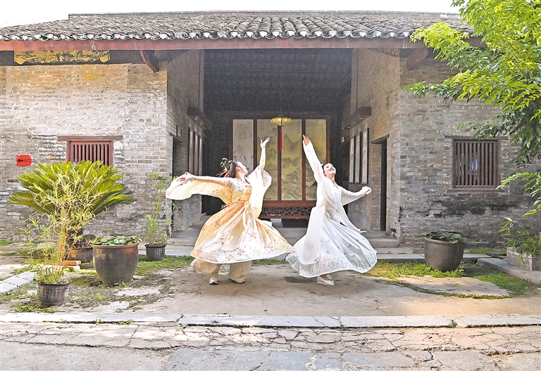两名游客在广西来宾市象州县罗秀镇纳禄村的古宅里翩翩起舞。