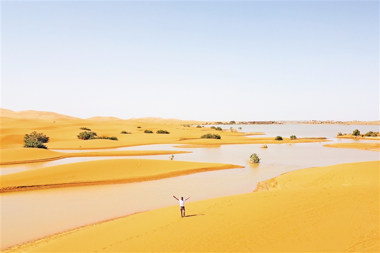 10月2日,一名男子游览摩洛哥东南部拉希迪耶附近暴雨过后的沙漠。