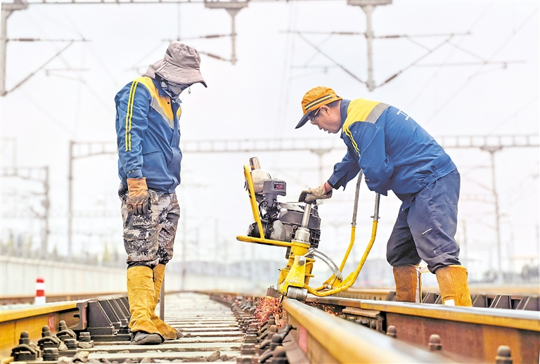 10月16日,银川线路车间职工在银川站进行钢轨肥边精磨。连日来,中国铁路兰州局集团有限公司银川工务段狠抓设备秋检黄金期,加大管内列车径路、道岔咽喉和重点薄弱线路设备的检查整修力度,全力确保运输安全。 本报通讯员 苗术儒 摄