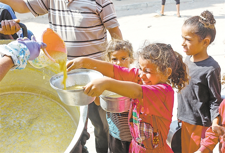 10月16日,在加沙地带南部汗尤尼斯,人们领取救济食物。 新华社/路透