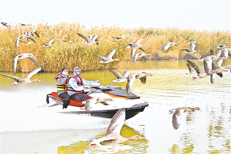 10月17日,群雁在领航员的引领下在沙湖上飞翔。每一只大雁都像是一个灵动的音符,在秋日沙湖的乐章中奏响美妙的旋律,它们的身影与沙湖的景色相互映衬,构成如诗如画的秋日美景。 本报记者 王鼎 摄
