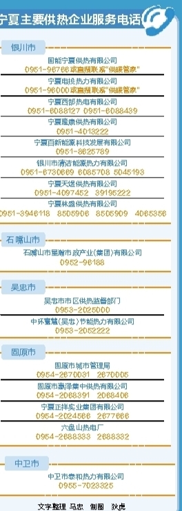 宁夏主要供热企业服务电话 银川市 国能宁夏供热有限公司 0951-96766或直搜联系“供暖管家” 宁夏电投热力有限公司 0951-96000或直搜联系“供暖管家” 宁夏西部热电有限公司 0951-6088127 0951-6088439 宁夏隆康供热有限公司 0951-4013222 宁夏百新能源科技发展有限公司 0951-8625789 银川市清洁能源热力有限公司 0951-6730669 6085708 5045193 宁夏天煜供热有限公司 0951-4097452 39195222 宁夏林盛供热有限公司 0951-3946118 8505906 8505909 4065356 石嘴山市 石嘴山市星瀚市政产业(集团)有限公司 0952-96188 吴忠市 吴忠市市区供热监督部门 0953-2025000 中环寰慧(吴忠)节能热力有限公司 0953-2052222 固原市 固原市城市管理局 0954-2670031 2670005 固原市惠泽集中供热有限公司 0954-2068391 2068406 宁夏正祥实业集团有限公司 0954-2024566 2677666 六盘山热电厂 0954-2688333 2688332 中卫市 中卫市泰和热力有限公司 0955-7023325