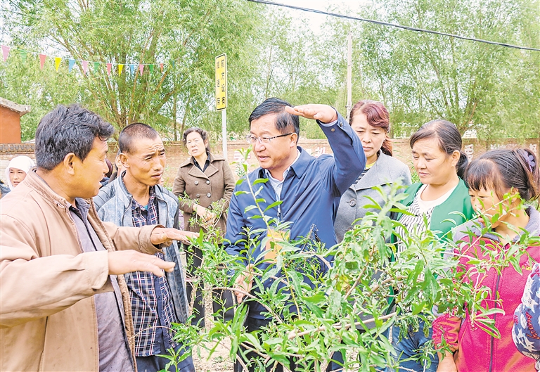 中宁县科技特派员朱金忠(中)在枸杞园中进行技术指导。