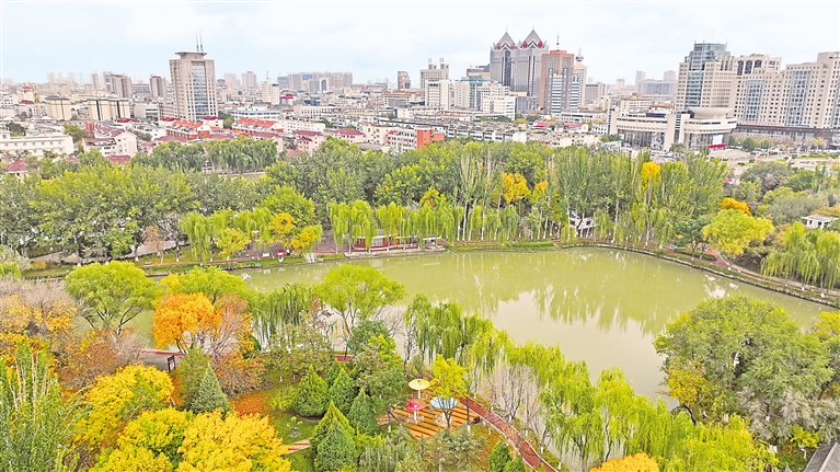 10月21日,雨后航拍下的中山公园秋景。近年来,银川市以绿色生态为底色,着力打造亲水近水乐水的公共空间,切实提升市民的获得感和幸福感。本报记者 何耐江 摄